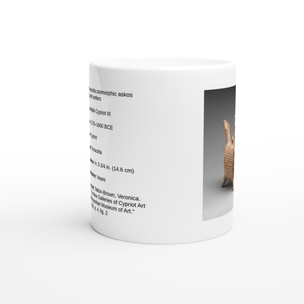 The askos dates to Middle Cypriot III, roughly 1725–1600 BCE, a period when Cypriot potters routinely gave functional vessels animal bodies but rarely added antlers. Antlered forms are uncommon enough in the corpus that their appearance suggests a specific referent, likely the Persian fallow deer native to the island until its modern extinction.